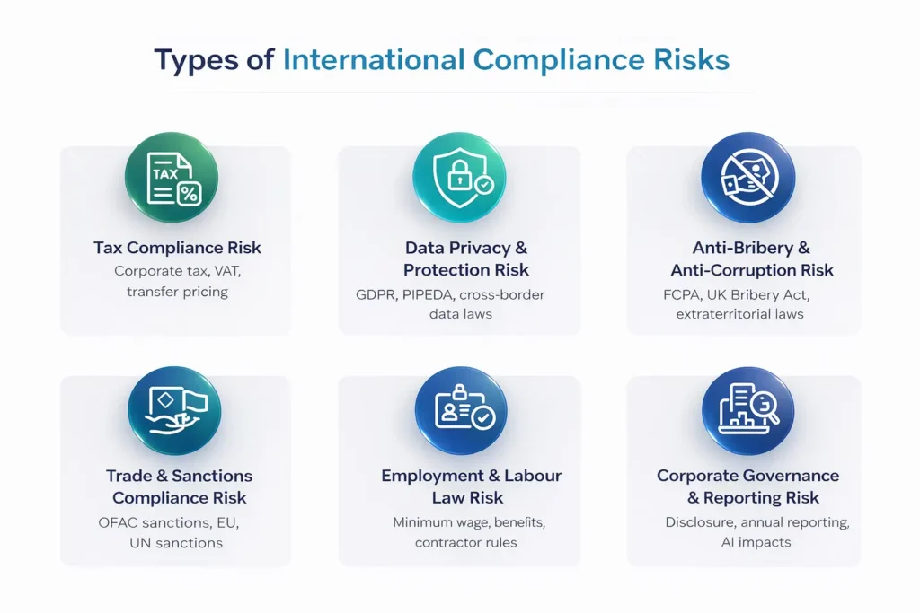 International compliance risk refers to the legal, financial, and reputational harm a foreign company faces when it fails to meet the regulatory requirements of the country it operates in. It covers tax, data privacy, anti-corruption, employment law, and trade compliance obligations.